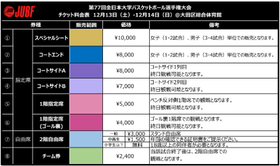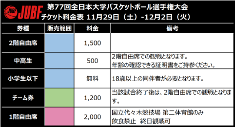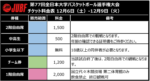 ■第77回全日本大学バスケットボール選手権大会 チケット販売概要